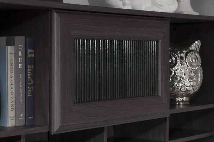 Additional storage on the overhead hutch includes open shelf space for books, plus a flip-open door with a fluted glass facade and four work-in-progress drawers.
