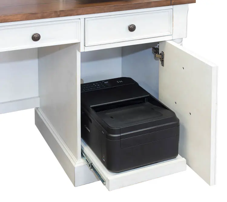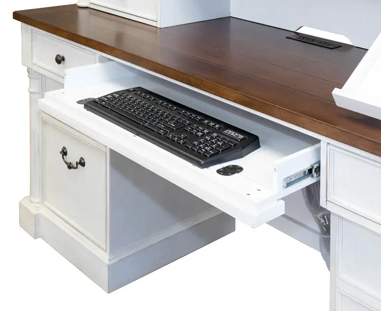 • Desk Features include: 1 Drop Front Keyboard / Pencil Drawer, 3 Utility Drawers, 1 Letter / Legal File Drawer, 1 Pull-Out Printer Tray, 1 Power Center