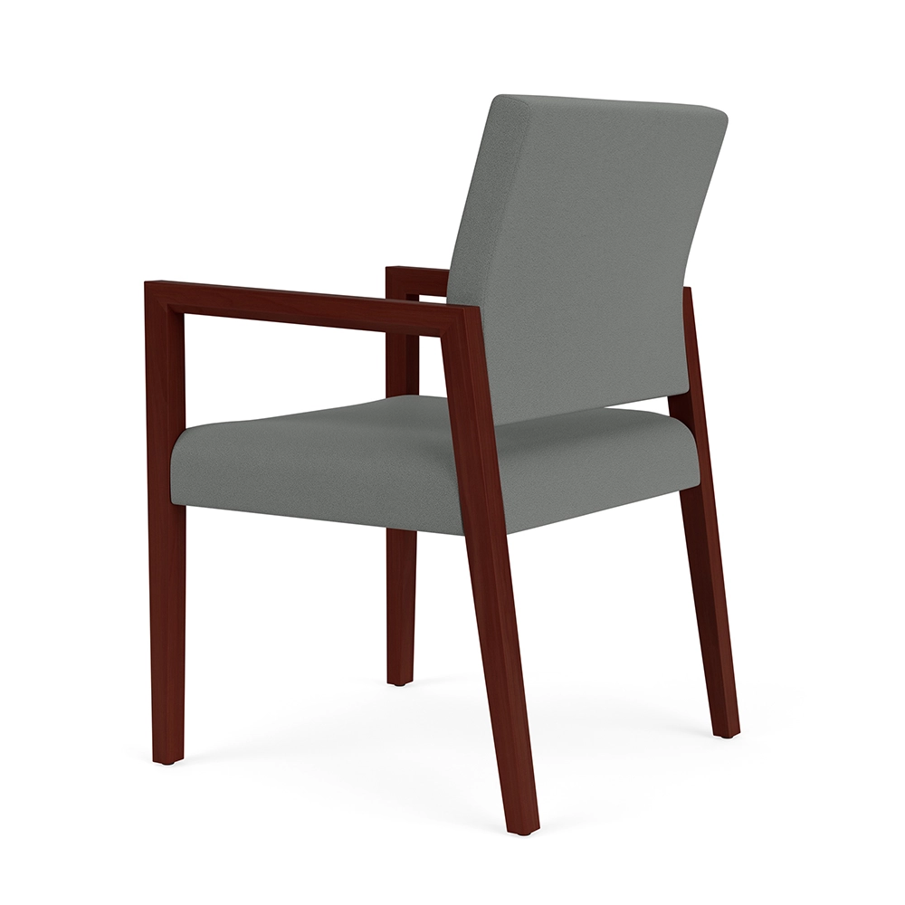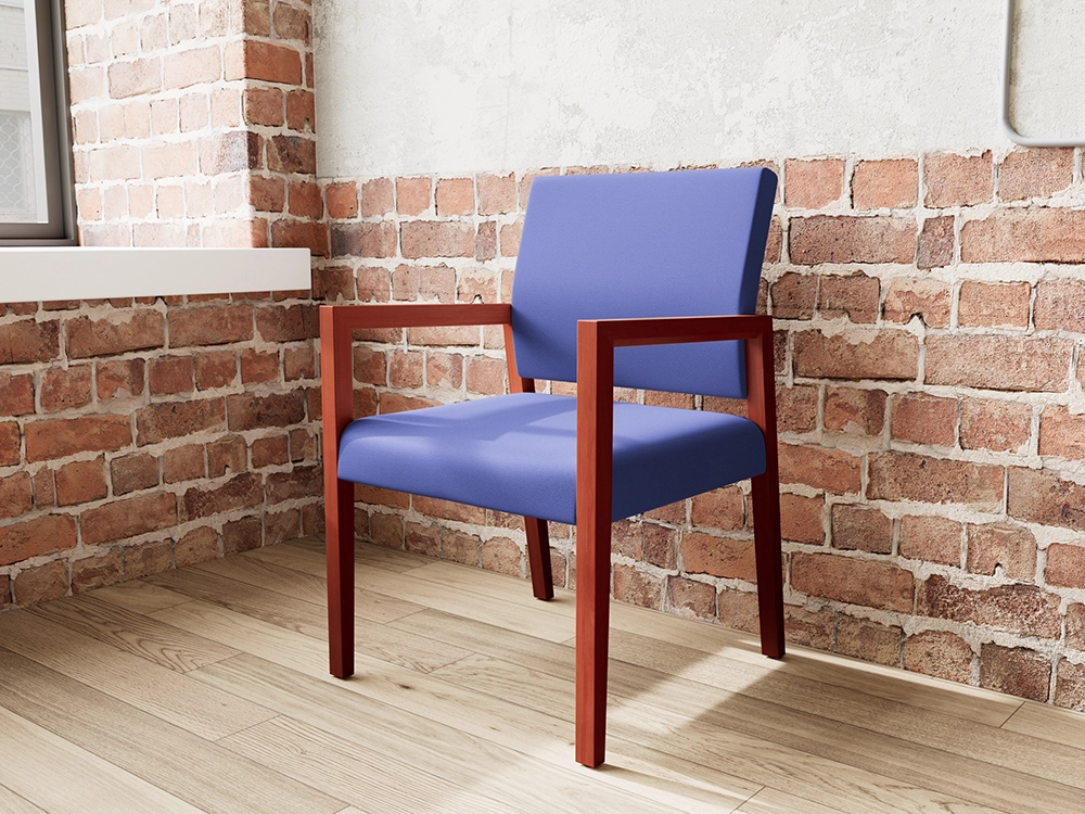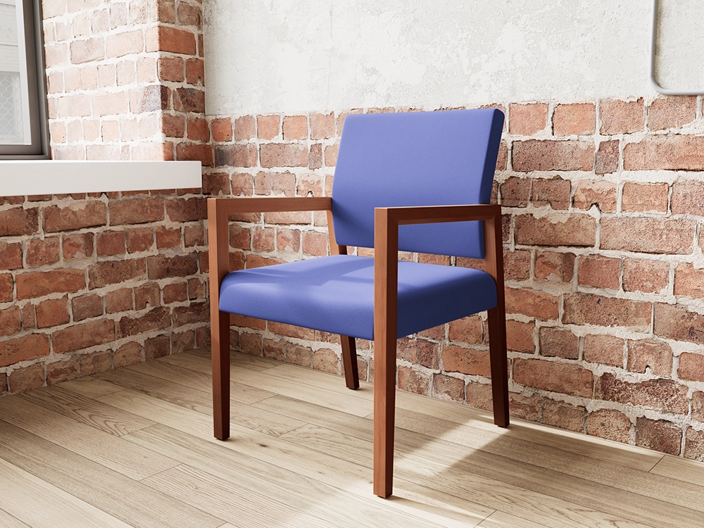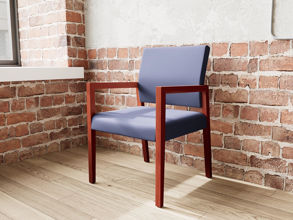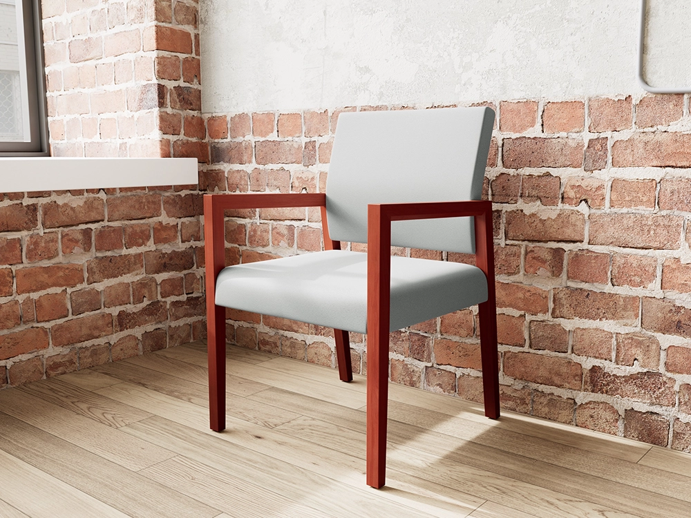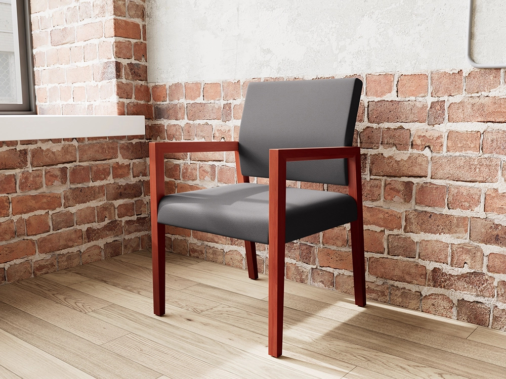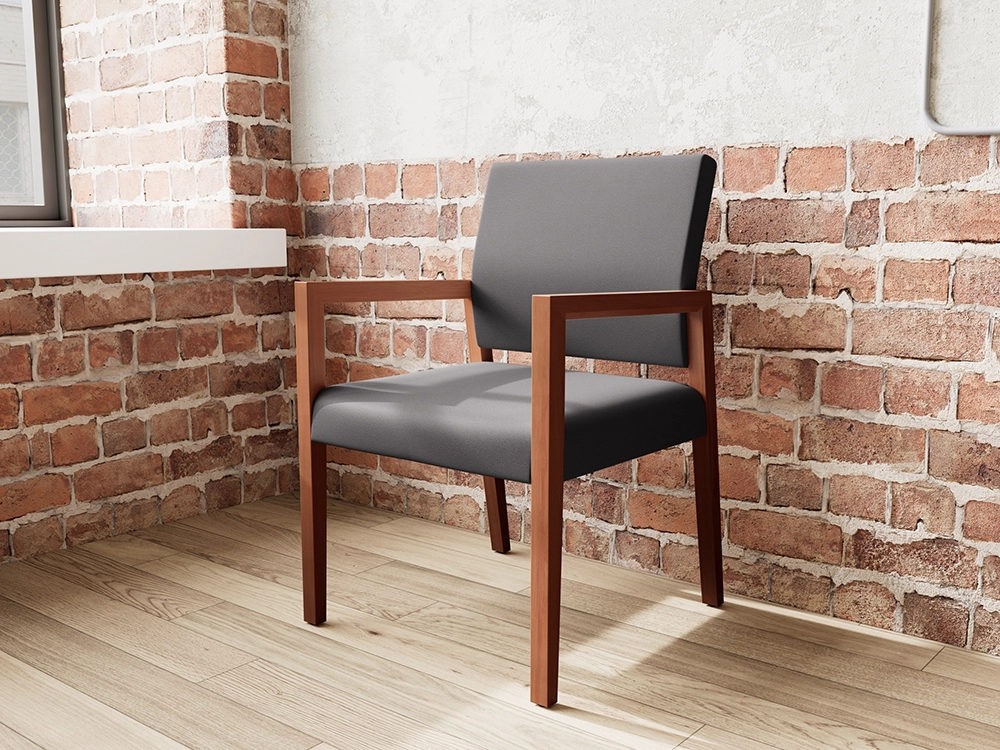The Brooklyn guest chair with its contemporary geometric styling, distinctive chamfered edge under the armrest, and upholstered seat and back cushions will give your space an elegant, sophisticated look.