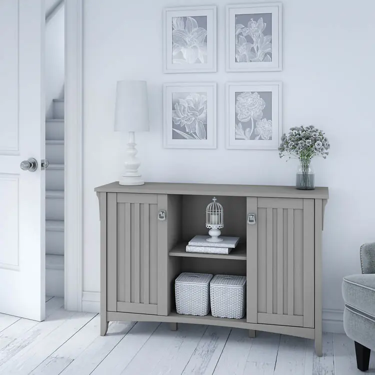 The Bush Furniture Salinas Storage Cabinet with Doors blends unique details and adjustable features for use in a variety of spaces.