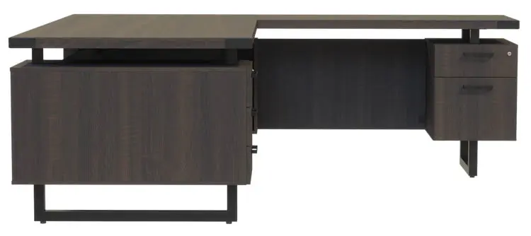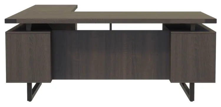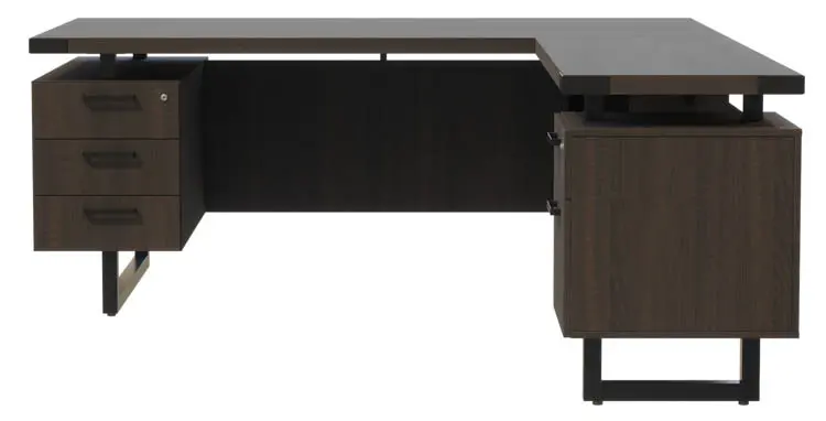 • Complete with double pedestals featuring one with three storage-sized drawers and one with a storage drawer and a file drawer accentuated with discrete brackets giving the appearance of a floating workstation