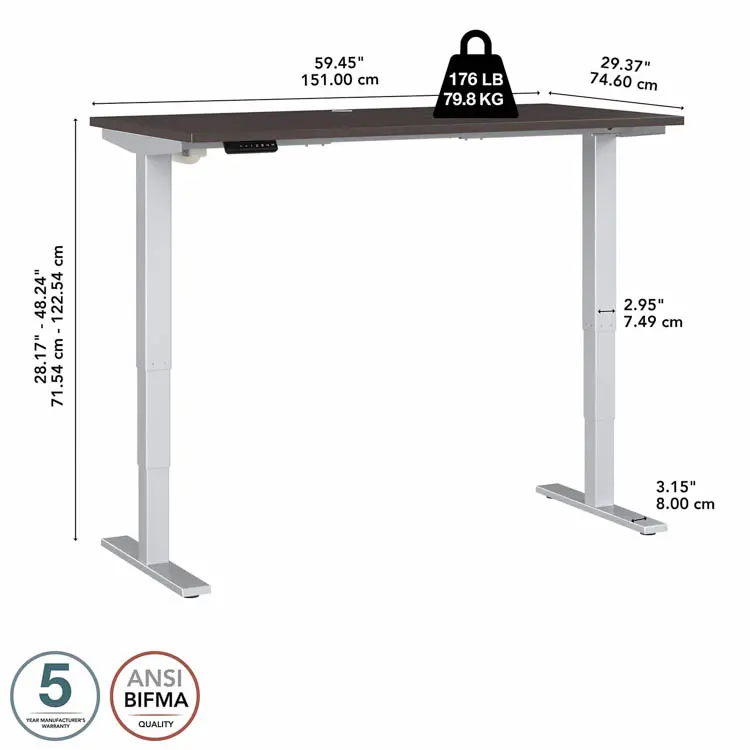 Three stage units lift the 60" W x 30" D desktop anywhere from 28 to 48" from the floor at a speed of 1.25" per second.