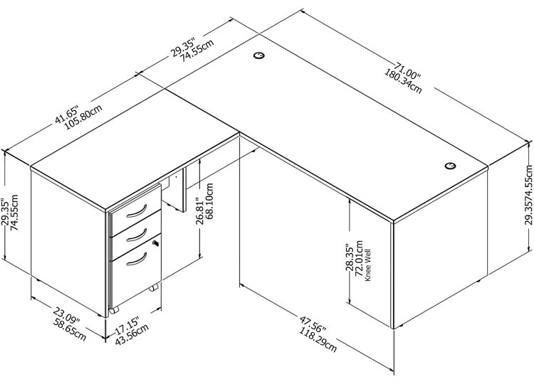 Desk Dimensions: 71.02" W x  71.02" D x 29.84" H.