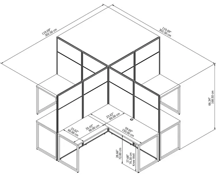 • Bundle includes: Set of 4 60"W x 24"D Straight Office Desks, Set of 4 36"W x 24"D Desk Returns, Set of 4 60"W x 66"H Cubicle Panels with Corner Connectors
