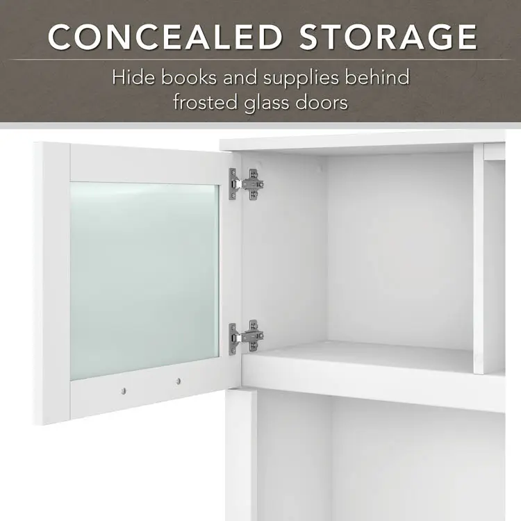 The Hutch attaches to the desktop and adds frosted glass doors for concealed storage in addition to open cubby spaces with two shelves.