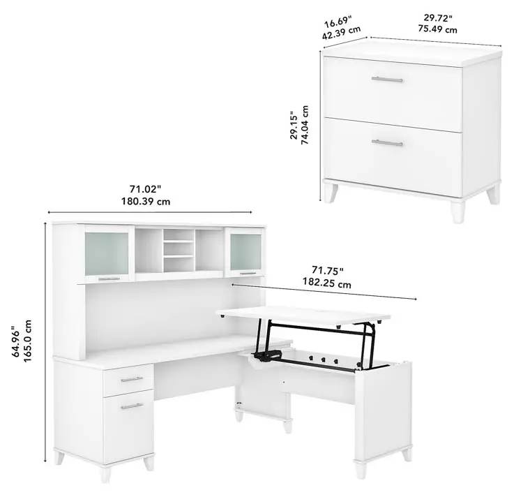• Bundle includes: 72"W Office Desk with Drawers, 42"W Sit to Stand Return, 72"W Hutch, 2 Drawer Lateral File Cabinet