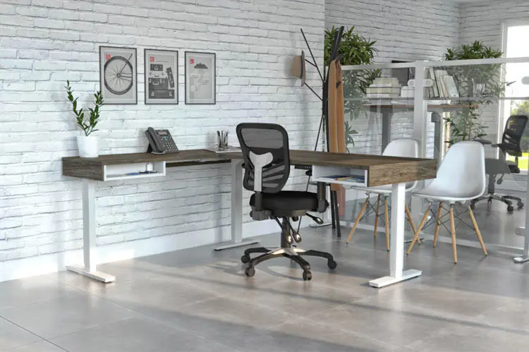 • The 3-legged L-shaped workstation allows the large surface to be raised and lowered at once