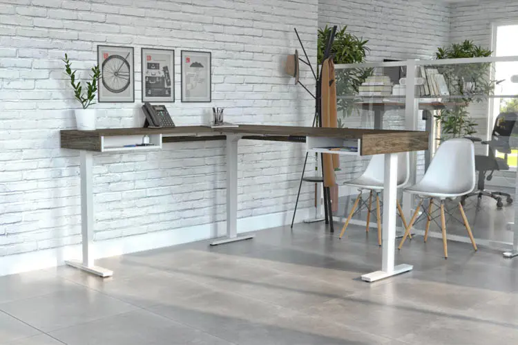 The 3-legged L-shaped workstation allows the large surface to be raised and lowered at once.