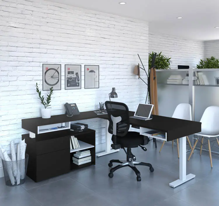The credenza fits seamlessly under the return of the L-shaped height-adjustable workstation and offers plenty of space with 1 utility drawer, 1 file drawer and open space.