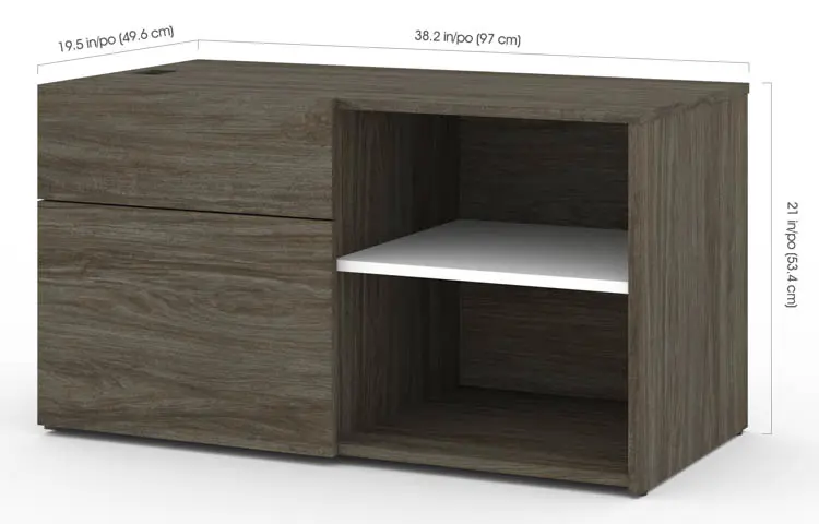 The credenza fits seamlessly under the return of the L-shaped height-adjustable workstation and offers plenty of space with 1 utility drawer, 1 file drawer and open space.