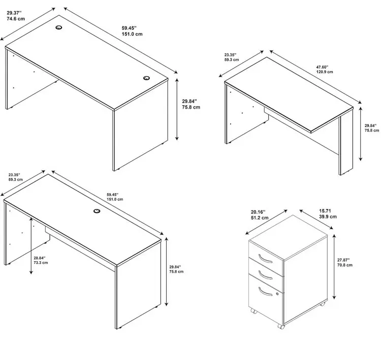 • Bundle includes: 60"W x 30"D Office Desk, 60"W x 24"D Credenza Desk, 48"W x 24"D Desk Bridge, and Assembled 3 Drawer Mobile File Cabinet
