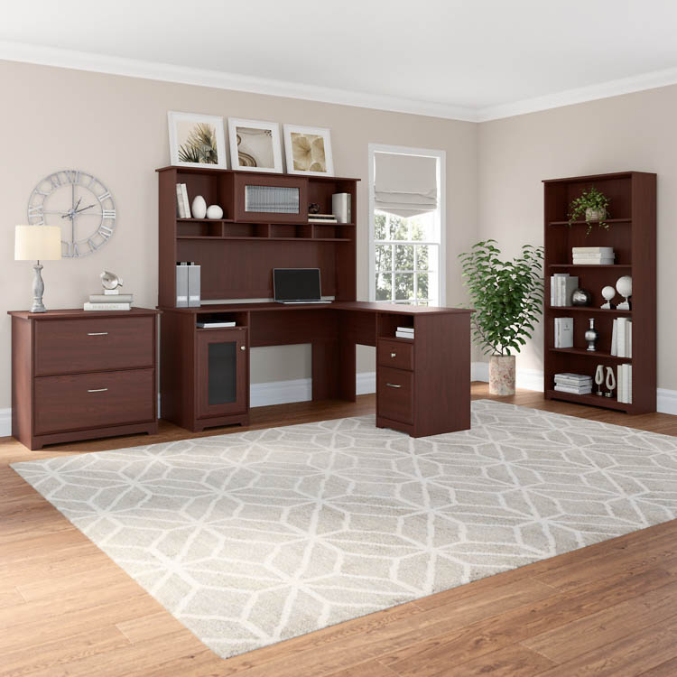 Work in style with the Bush Furniture Cabot L-Shaped Desk with Hutch, Lateral File Cabinet and 5 Shelf Bookcase.