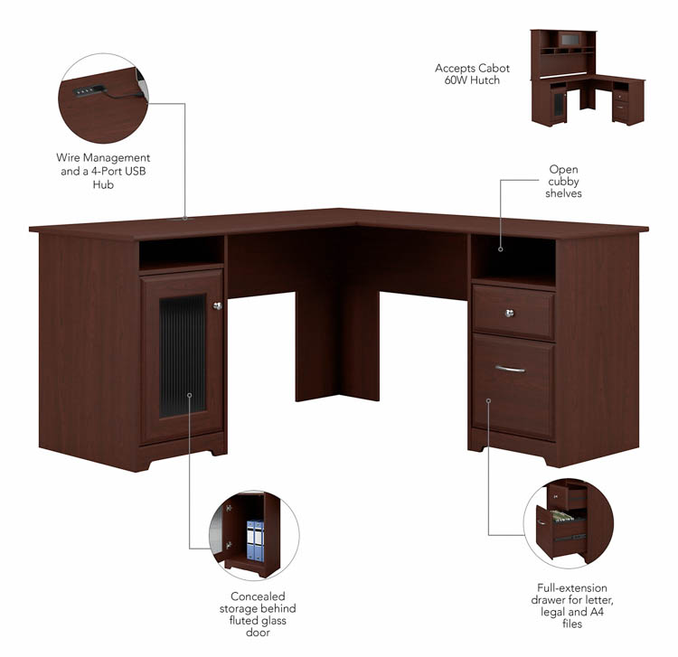 Desk storage details include an enclosed cabinet with a stylish fluted glass door, a box drawer for supplies and a full-extension file drawer.