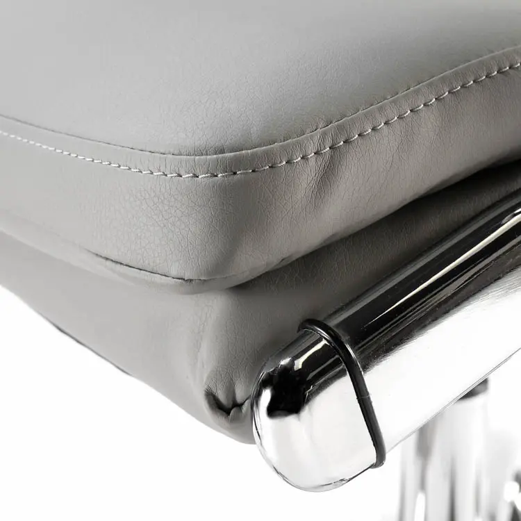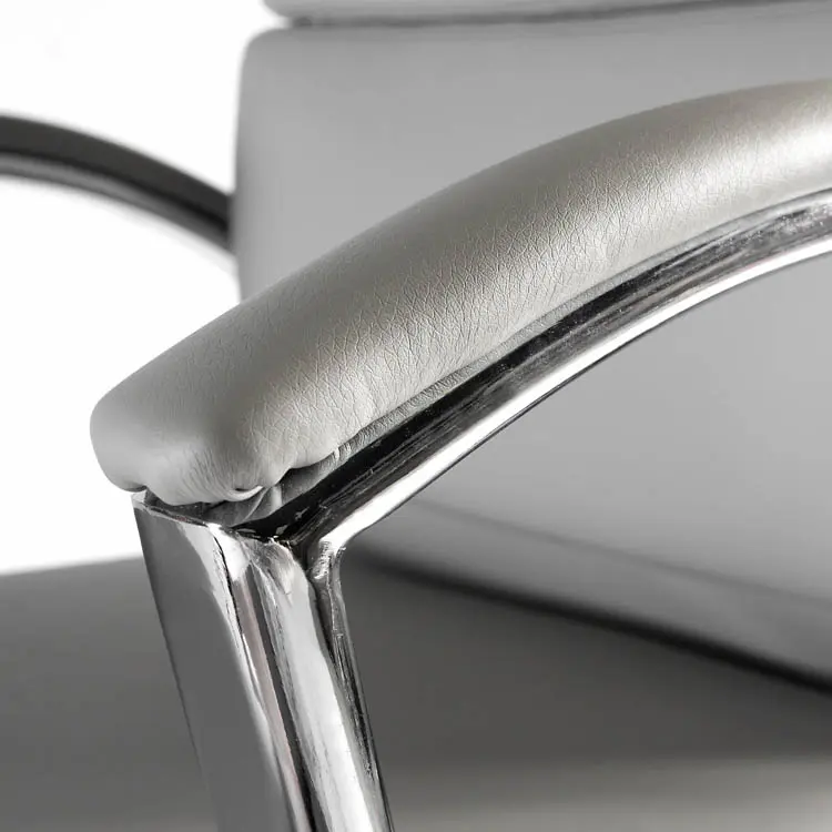 • Light Gray bonded leather upholstery is complemented by contemporary chrome accents