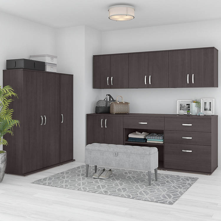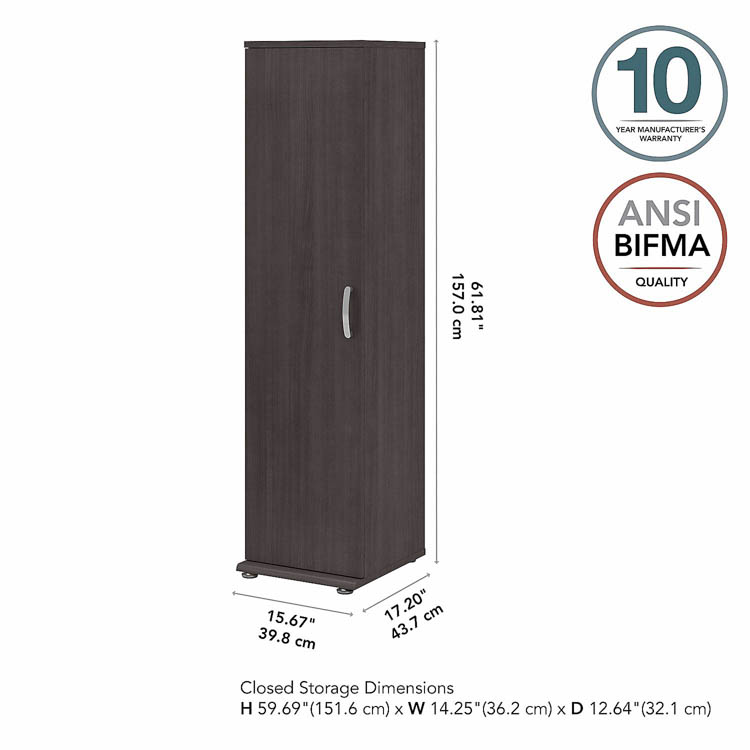 The Bush Business Furniture Universal Narrow Clothing Storage Cabinet with Door and Shelves features a commercial quality design that's built to last and provides ample room for organization.
