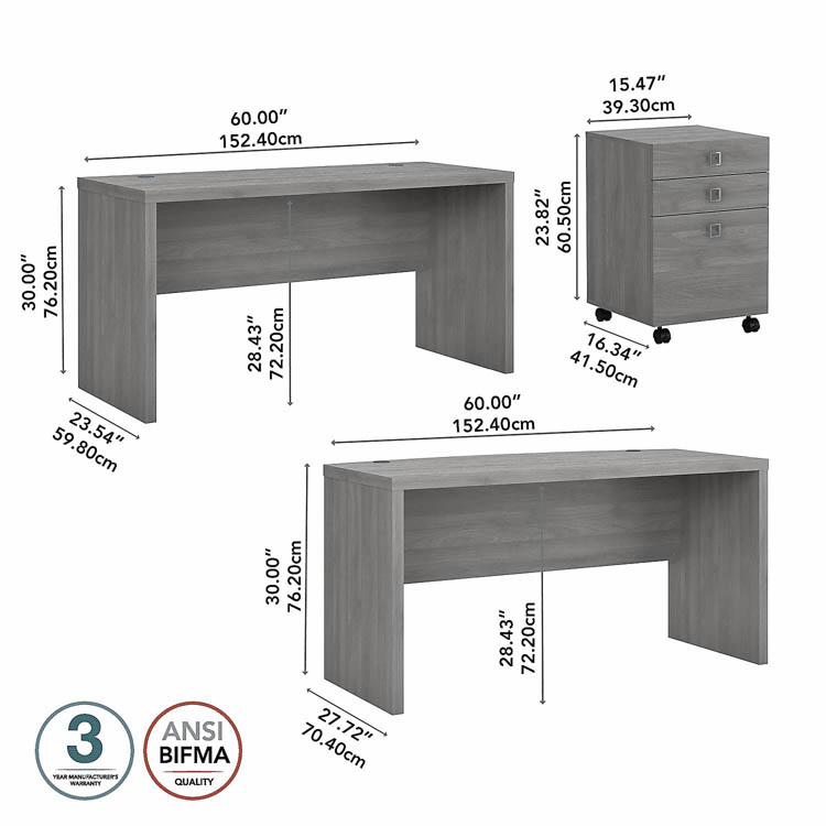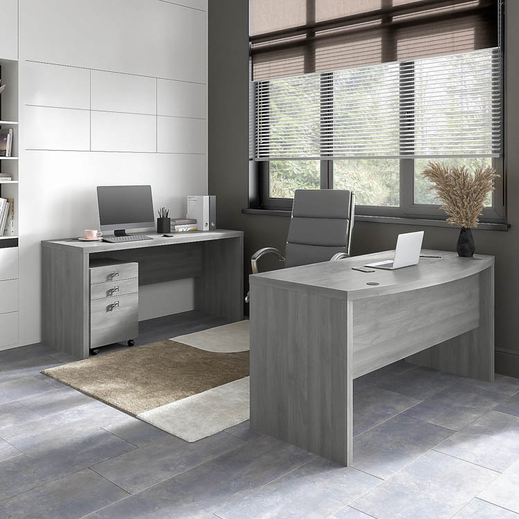 • Office furniture set includes 60" W Bow Front Desk, 60" W Credenza and 3 Drawer Mobile File Cabinet