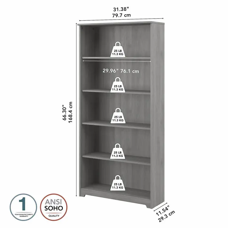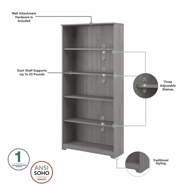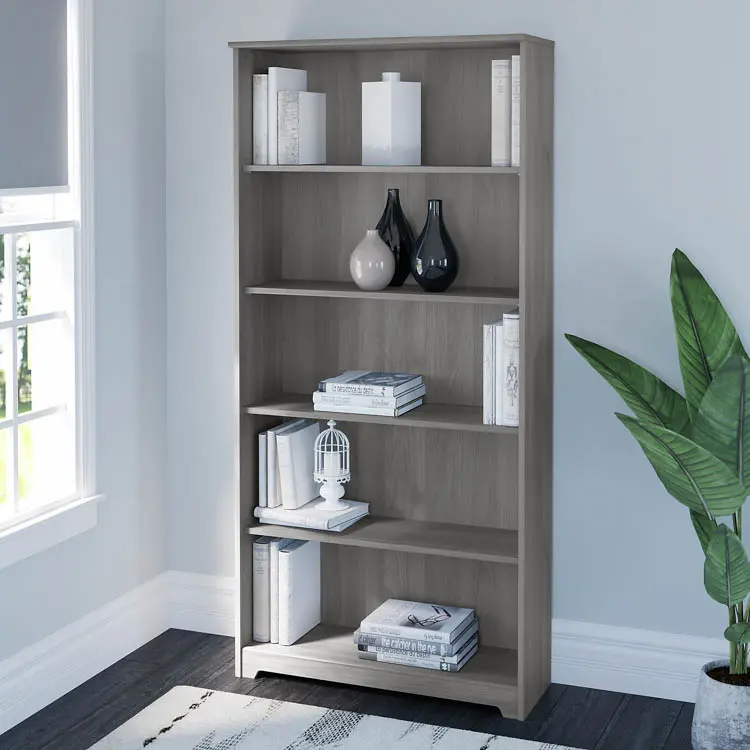 • Bush Furniture Cabot 5 Shelf Bookcase has 2 fixed shelves and 3 adjustable shelves