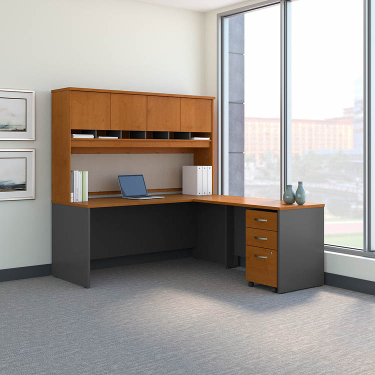 The Bush Business Furniture Series C L-Shaped Desk with Hutch and Assembled 3 Drawer Mobile File Cabinet has expansive work surfaces, convenient storage features and a sturdy design for years of everyday use.