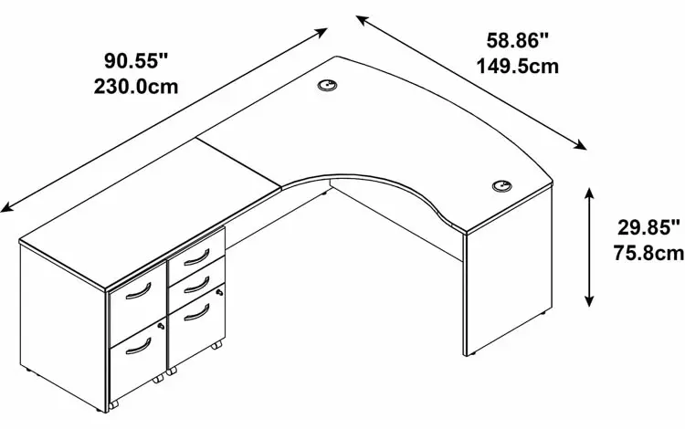 • Bundle Includes: 60"W x 43"D L-Shaped Bow Front Desk, 48"W Return Bridge, Assembled 3-Drawer Mobile Pedestal, and Assembled 2-Drawer Mobile Pedestal