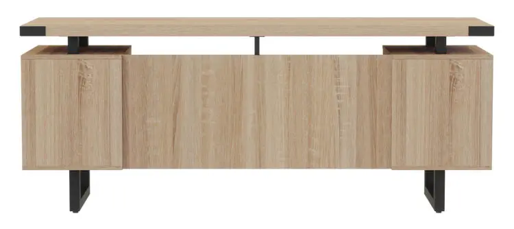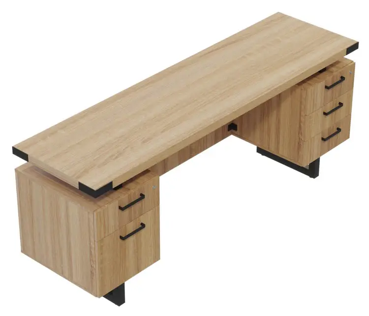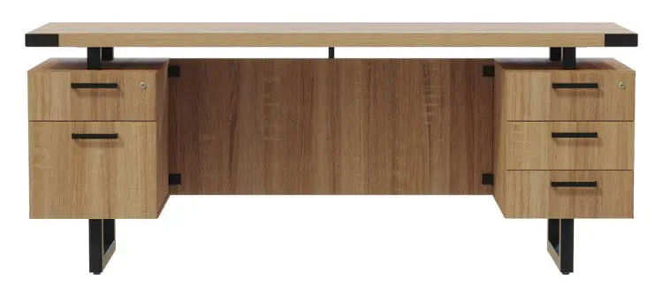 Comes complete with double pedestals featuring one with three storage-sized drawers and one with a storage drawer and a file drawer accentuated with discrete brackets giving the appearance of a floating workstation.