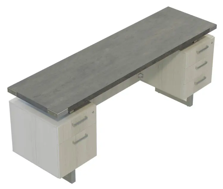 Comes complete with double pedestals featuring one with three storage-sized drawers and one with a storage drawer and a file drawer accentuated with discrete brackets giving the appearance of a floating workstation.