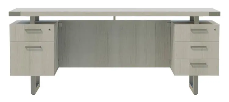 Comes complete with double pedestals featuring one with three storage-sized drawers and one with a storage drawer and a file drawer accentuated with discrete brackets giving the appearance of a floating workstation.