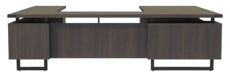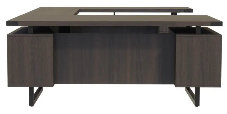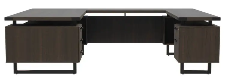 Comes complete with double pedestals featuring one with three storage-sized drawers and one with a storage drawer and a file drawer accentuated with discrete brackets giving the appearance of a floating workstation.