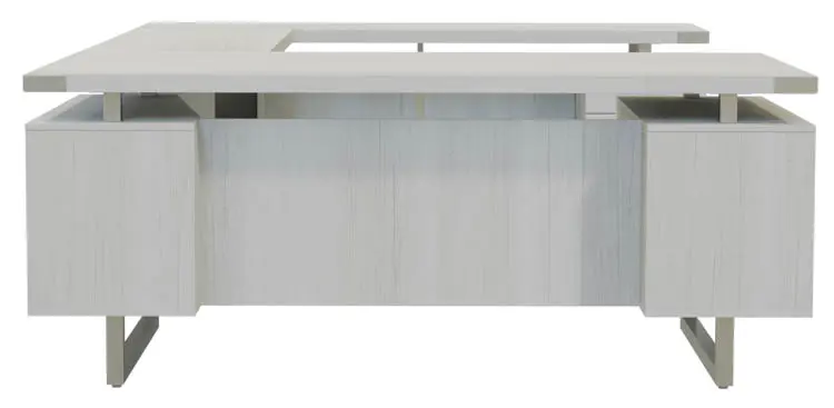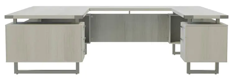 • Complete with double pedestals featuring one with three storage-sized drawers and one with a storage drawer and a file drawer accentuated with discrete brackets giving the appearance of a floating workstation