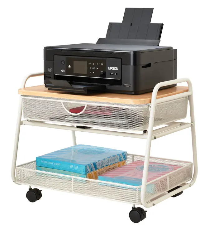 • Steel wire frame and shelf with two mesh baskets for storage of printers, fax machines, files or other supplies