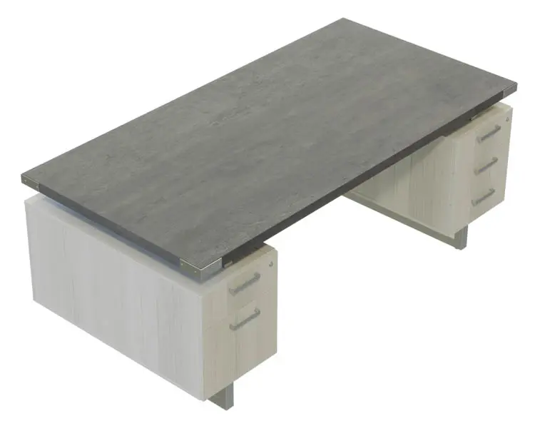 • Desks feature a floating 1 5/8” thick work surface on top of Silver or Black standoffs