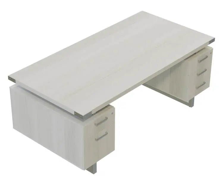 • Complete with double pedestals featuring one with three storage-sized drawers and one with a storage drawer and a file drawer accentuated with discrete brackets giving the appearance of a floating workstation