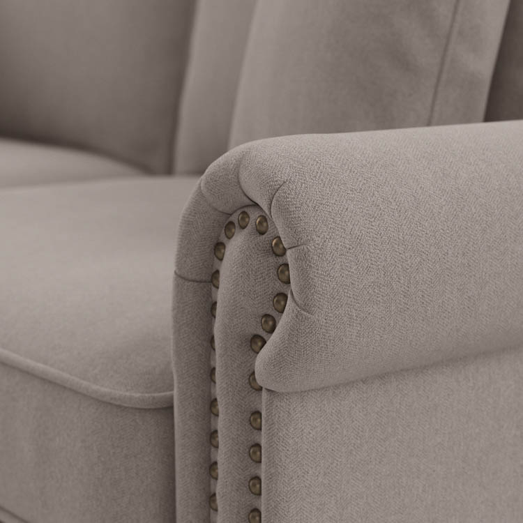 Espresso-stained rounded bun feet, rolled armrests and nailhead trim reflect a sophisticated style that perfectly complements French country, farmhouse, coastal and traditional decor. Herringbone upholstery options are available in several unique colors for a look that matches any space and taste.