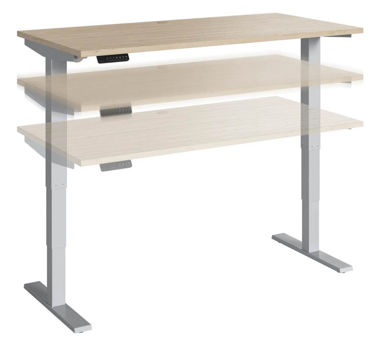 Three stage units lift the 60" W x 30" D desktop anywhere from 28 to 48" from the floor at a speed of 1.25" per second.