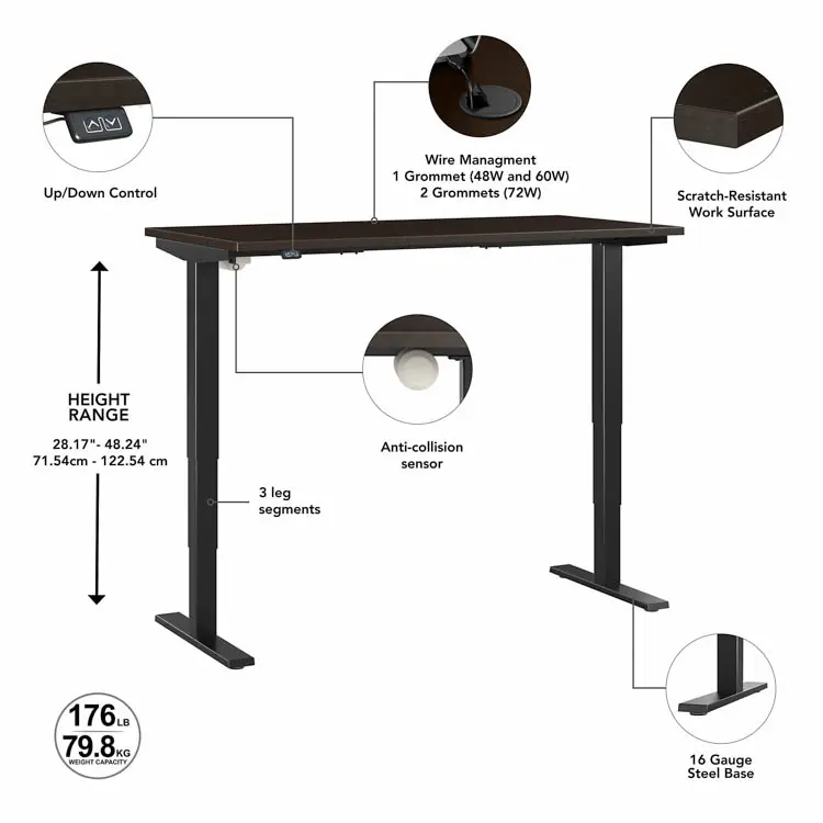 Three stage units lift the 60" W x 30" D desktop anywhere from 28 to 48" from the floor at a speed of 1.25" per second.