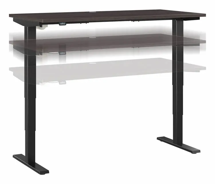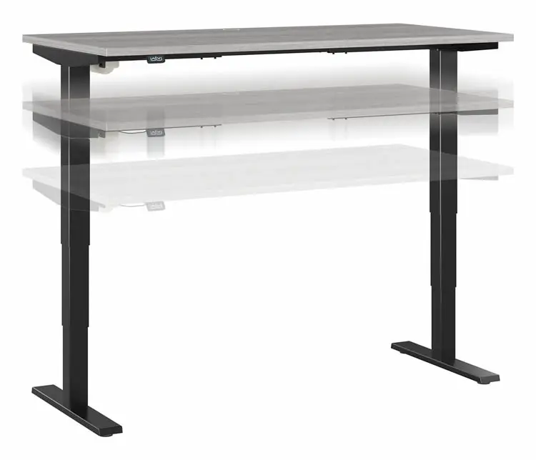 Three stage units lift the 60" W x 30" D desktop anywhere from 28 to 48" from the floor at a speed of 1.25" per second.