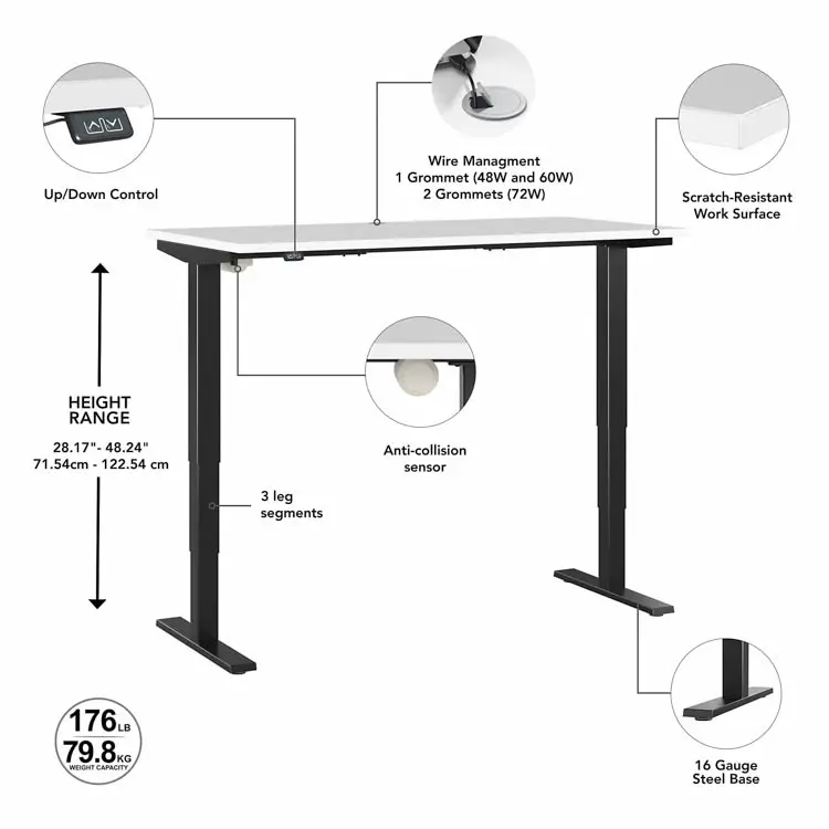 • Three stage units lift the Adjustable Desk anywhere from 28" to 48" from the floor at a speed of 1.25" per second