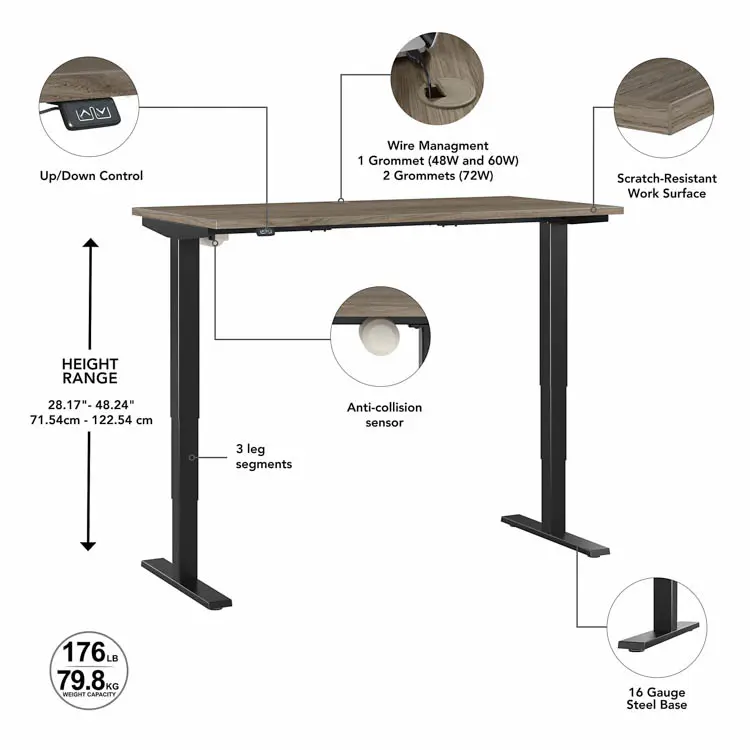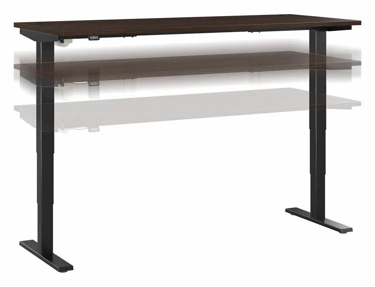 Three stage units lift the 72" W x 30" D desktop anywhere from 28 to 48" from the floor at a speed of 1.25" per second.