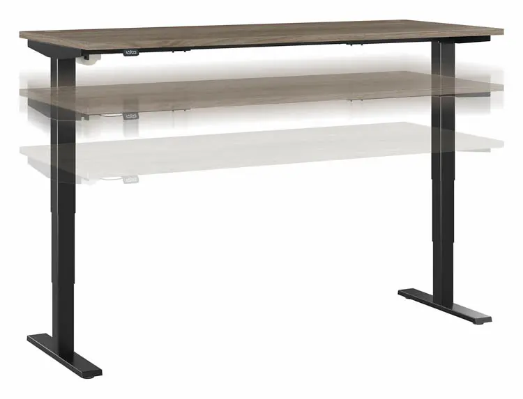 Three stage units lift the 72" W x 30" D desktop anywhere from 28 to 48" from the floor at a speed of 1.25" per second.