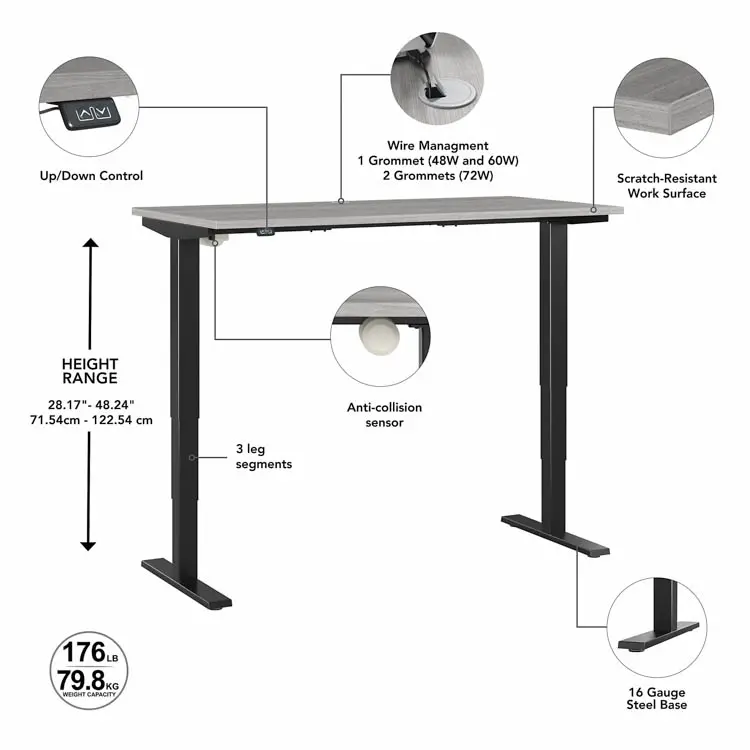 • Three stage units lift the Adjustable Desk anywhere from 28" to 48" from the floor at a speed of 1.25" per second