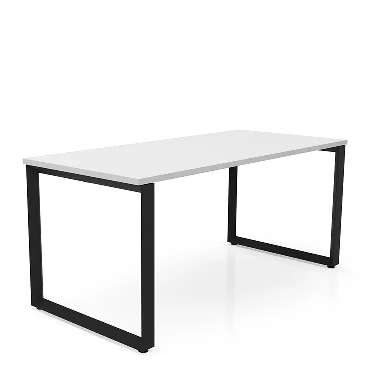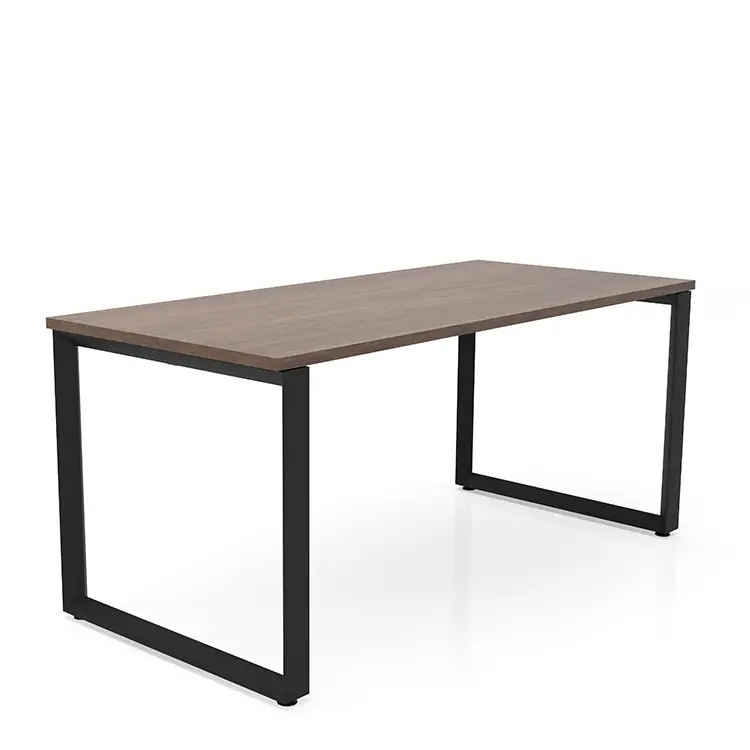 Desk features beveled loop style metal leg bases.
