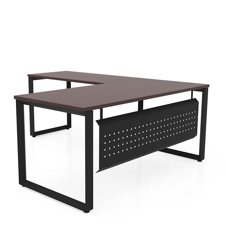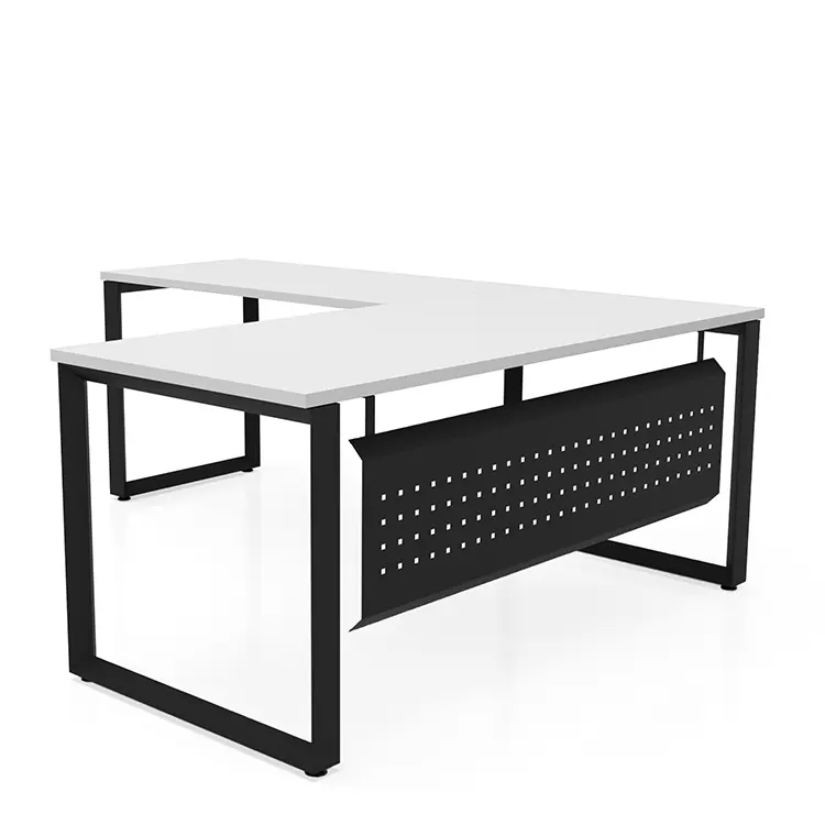 Desk features beveled loop style metal leg bases and perforated metal modesty panel.