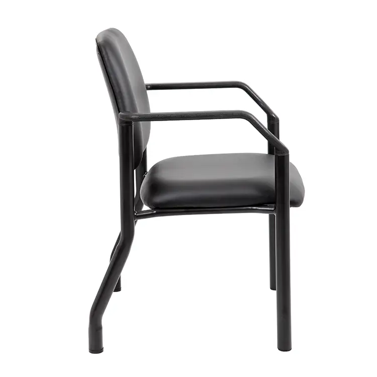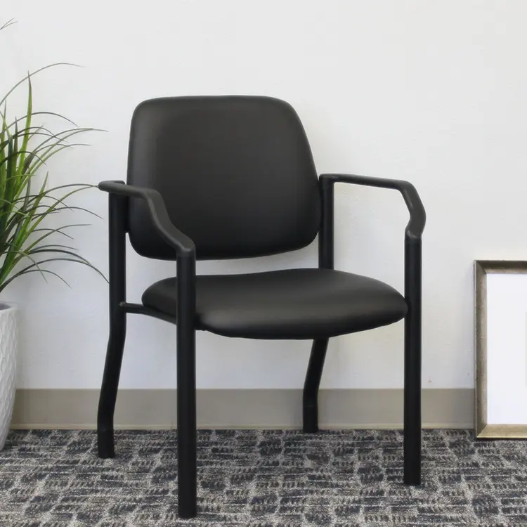 The guest chair is designed with a strong and easy to clean antimicrobial black vinyl material that lends a professional appearance along with a sturdy four leg tubular black steel base that offers coziness and strength.