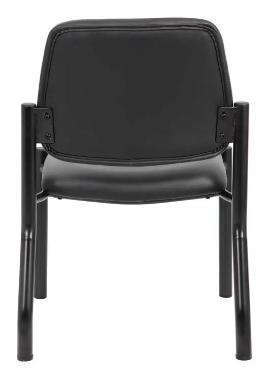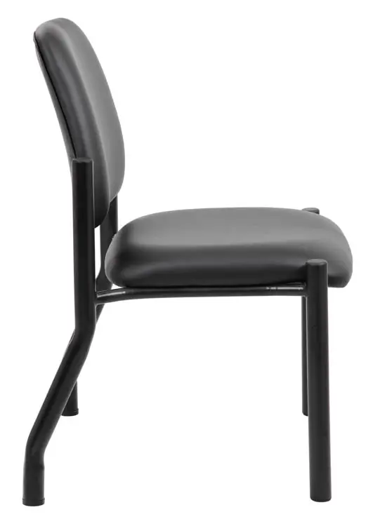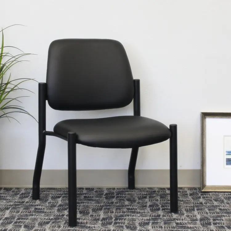 The guest chair is designed with a strong and easy to clean antimicrobial black vinyl material that lends a professional appearance along with a sturdy four leg tubular black steel base that offers coziness and strength.