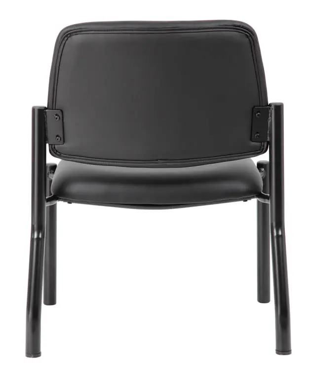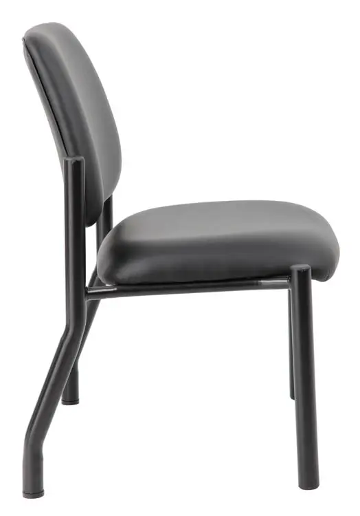 The guest chair is designed with a strong and easy to clean antimicrobial black vinyl material that lends a professional appearance along with a sturdy four leg tubular black steel base that offers coziness and strength.