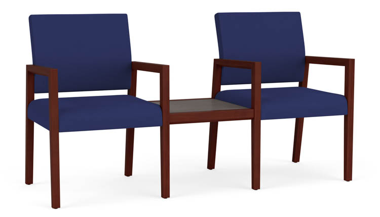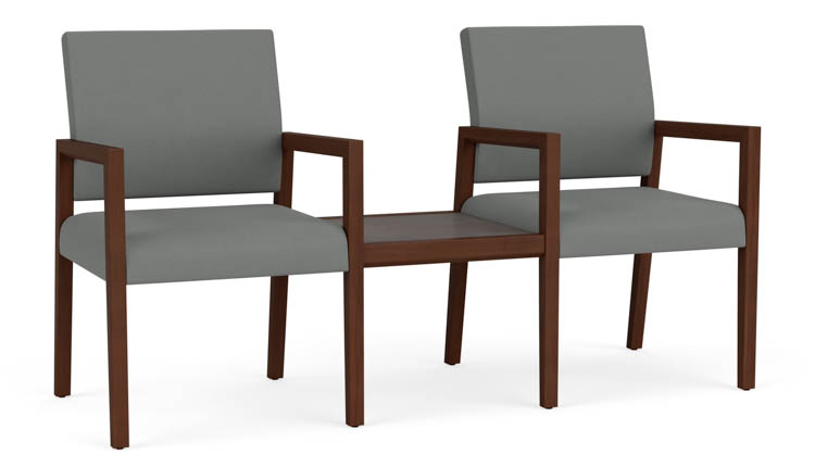 Available in 5 Polyurethane upholstery colors, and Walnut or Mahogany finish on frame, Earthen or Graphite Laminate Table.