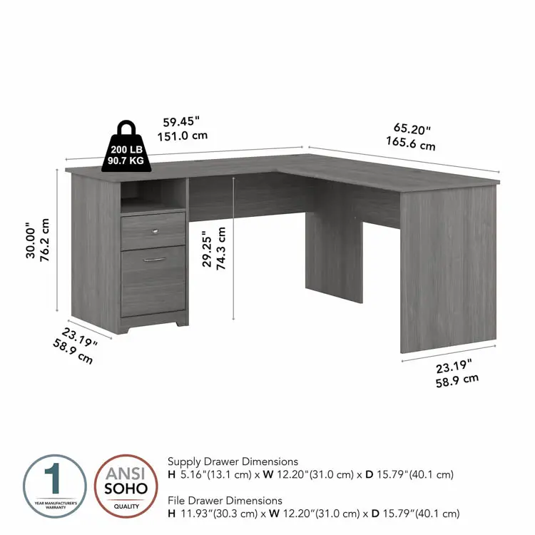 The L-Shaped Computer Desk with Drawers meets ANSI/SOHO quality test standards for safety and performance.