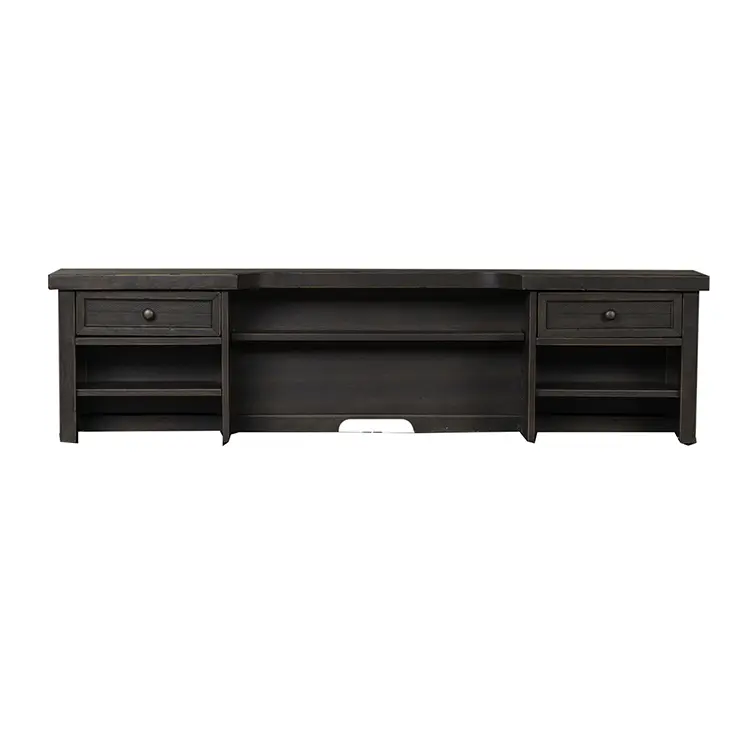 The Hutch features a center monitor cut out that is flanked by two interior storage drawers and two cubbies and planked top and side panels.