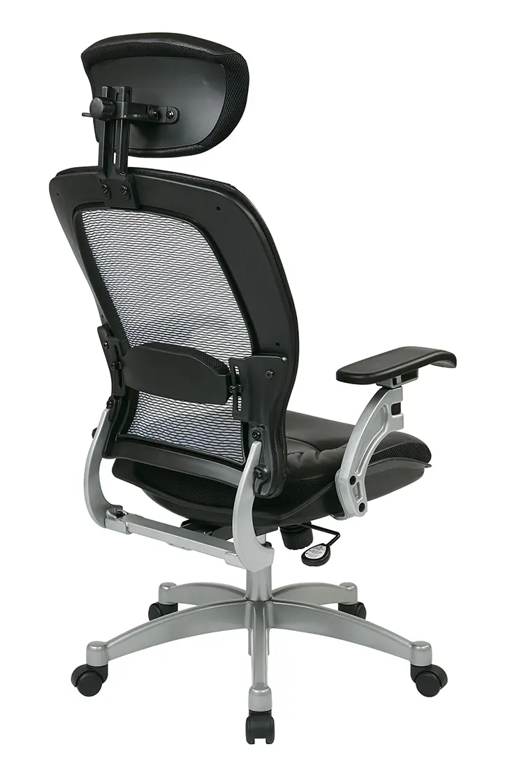 • Thick padded contour leather seat and light mesh back with adjustable lumbar support and V-back support