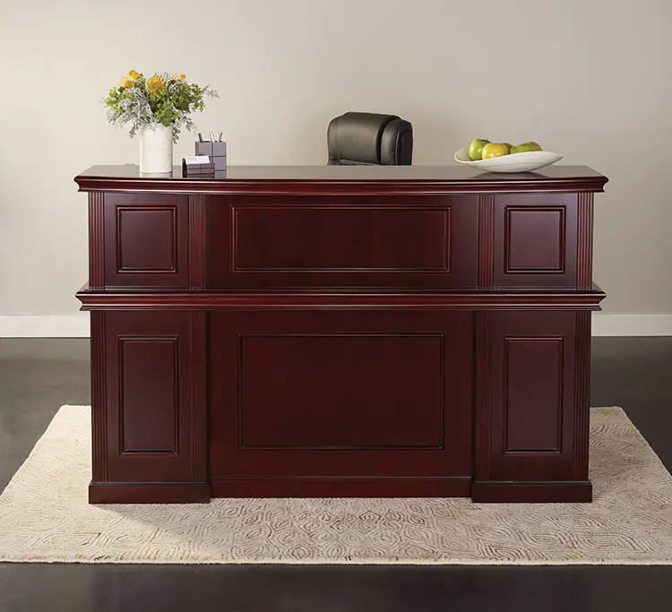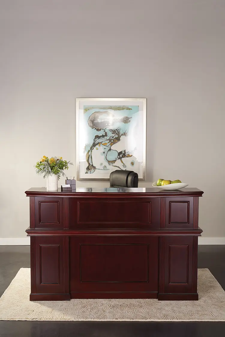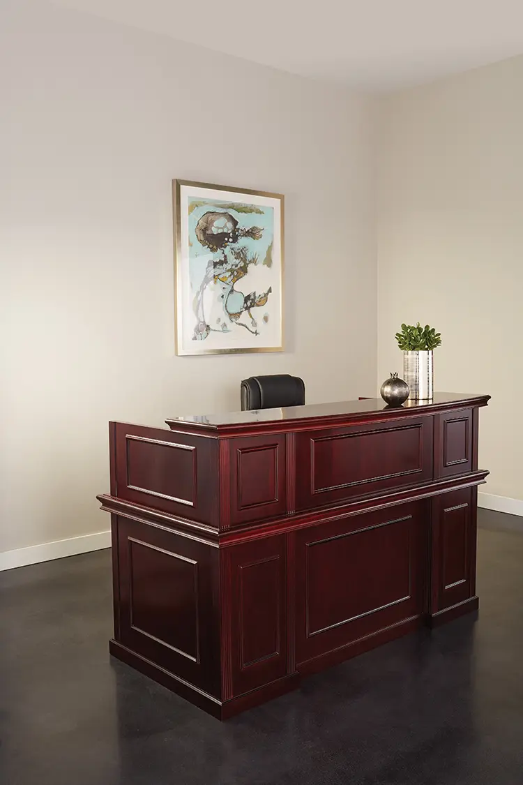 The double pedestal reception desk has unique parquet design work surface found throughout the Townhall collection on all work surfaces.