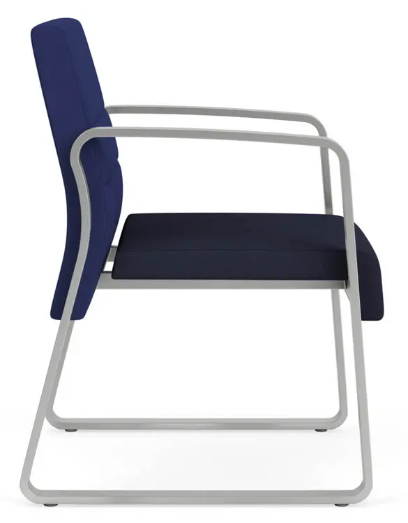The Waterfall guest chair with sled base, with its soothing yet powerful styling, sloped arm design, and upholstered seat and back cushions will give your space an inviting, welcoming air.